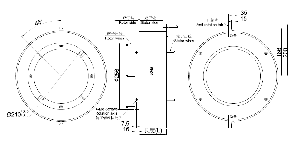● 外徑345mm, 通孔直徑為210mm,適用于<=210mm)的標準系列整體式精密導電滑環(huán)。*注意:如需<210mm的內(nèi)孔,可通過加內(nèi)襯軸套解決。