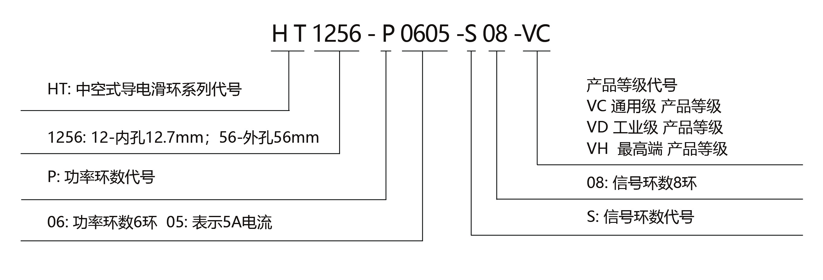 ● HT1256是標準系列過孔滑環(huán)(高速過孔滑環(huán)),,過孔直徑12.7mm(適用任何<=12.7mm),外徑為56mm精密導電滑環(huán)。