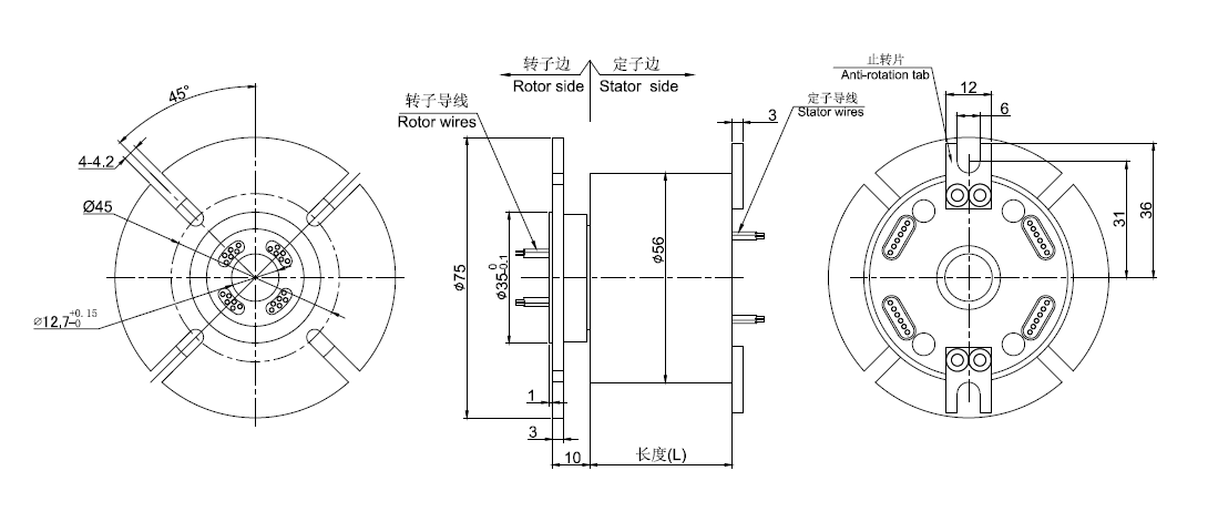● 轉(zhuǎn)子帶法蘭安裝, 通孔直徑為12.7mm(1/2",適用于<=12.7mm)的標(biāo)準(zhǔn)系列整體式精密導(dǎo)電滑環(huán)。*注意:如需<12.7mm的內(nèi)孔,可通過加內(nèi)襯軸套解決。